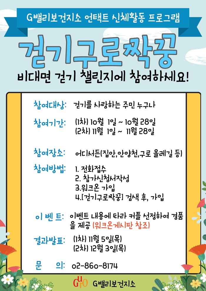 참여를 원하는 구로구민은 G밸리보건지소에 전화로 신청 하면 오는, 문자로 전송되는 참가신청서를 작성하고, 워크온(WalkOn) 앱을 다운받아 ‘걷기 구로 짝꿍’에 가입하면 걷기양이 자동 측정된다. 이름을 설정할 때는 ‘홍길동(춘향이)/춘향이(홍길동)’ 형식으로 짝꿍의 이름을 함께 적는다.