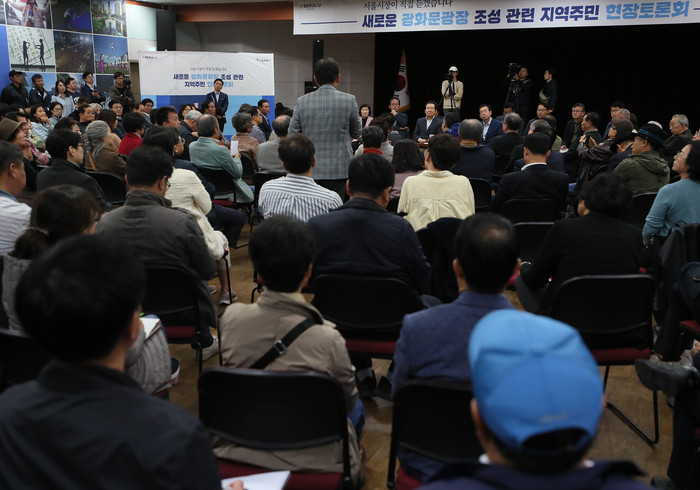 광화문광장 재구조화 전면 재검토와 소통 강화를 선언한 박원순 서울시장이 3일 오후 종로소방서에서 주민들과 현장토론회를 열고 의견을 듣고 있다.