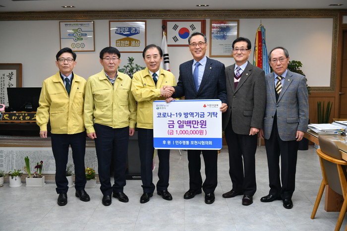 경기 포천시는 10일 민주평화통일자문회의 포천시협의회로부터 코로나19 예방을 위한 방역에 사용해달라며 100만의 성금을 기탁받았다. 성금은 코로나19 예방에 쓰일 예정이다. 사진은 박윤국 시장(왼쪽에서 세 번째)과 관계자들의 기념촬영 모습. (사진제공=포천시청)
