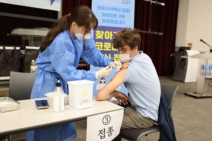 | ▲지난 21일 숭실대학교에 마련된 ‘찾아가는 백신접종센터’에서 외국인 유학생이 접종을 받고 있다. (사진제공=동작구청) |