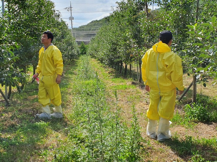 경기 연천군 농업기술센터는 식물방역법상 국가검역병으로 규정된 과수화상병과 가지검은마름병을 예방하고자 방제활동에 총력을 기울이고 있다. 사진은 28일 예찰반이 화상병 발생농장 반경 5km 내 사과·배 농가를 대상으로 점검을 하고 있는 모습. (사진제공=연천군청)