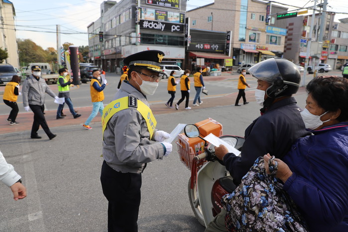 경기 이천경찰서는 최근 교통사망사고 절반줄이기를 목표로 이천시민의 교통질서 시민의식 개선을 위해 경찰서, 각 지구대 파출소 각 장소를 선정한 후 교통안전 일제 캠페인을 실시했다. 사진은 오지용 서장이 시민에게 교통안전 홍보물을 건네고 있는 모습. (사진제공=이천경찰서)