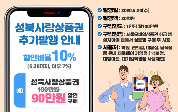 [시민일보 = 홍덕표 기자] 성북구(구청장 이승로)는 골목상권 소비와 소상공인 매출확대를 위해 발행하는 모바일 '성북사랑상품권'을 20일부터 10% 할인된 금액으로 추가 판매한다.