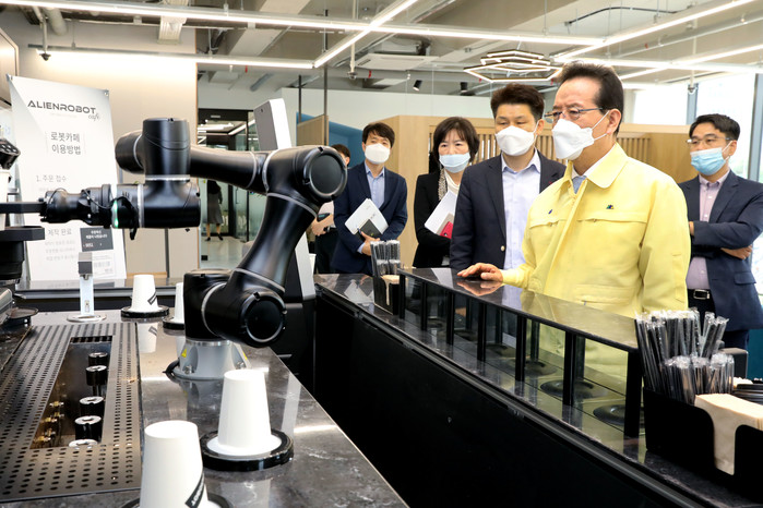 정순균 강남구청장이 최근 로봇 관련 창업 지원을 목적으로 구축된 자곡동 강남 ICT · 로봇 리빙랩에 방문, 기업입주 공간 및 실험실 관련 현장을 살폈다. 사진은 관계자들과 현장을 살펴보고 있는 정 구청장의 모습. (사진제공=강남구청)