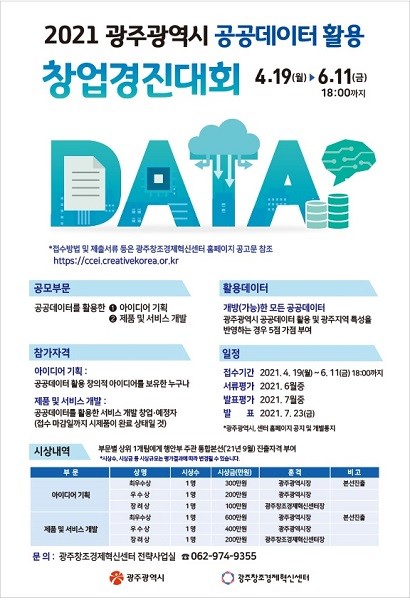 광주시가 주최하고 (재)광주창조경제혁신센터가 주관하는 이번 창업경진대회의 공모분야는 아이디어 기획과 제품 및 서비스 개발 2개 부문으로 공공데이터를 활용한 창의적인 아이디어를 보유한 누구나 참가할 수 있다.