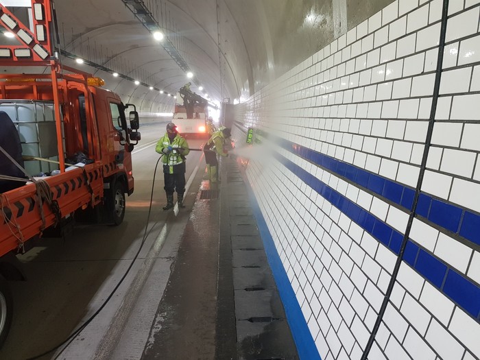 경기 오산시가 최근 봄을 맞아 세교터널, 금암터널 약 750m 구간에 대한 벽면 물청소와 배수로 준설을 실시해 차량매연·먼지·염화칼슘 등으로 오염된 묵은때를 벗겨내고 미세먼지를 제거했다. 사진은 터널 벽면을 물청소하는 관계자들의 모습. (사진제공=오산시청)