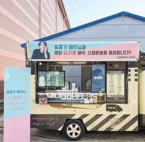 22일 한 간식차 업체는 SNS를 통해 "영화 '승리호' 송중기 배우님 서포트~ 막바지 열촬 중이신 송중기 배우님과 스탭, 배우님들을 위해 #커피 #음료 넉넉하게 준비해주셨어요~ 항상 한결같이 반갑게 맞아주시는 송중기 배우님"이라는 글과 함께 사진들을 게재했다.