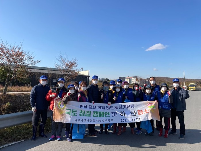경기 이천시 대월면 바르게살기운동위원회와 주민 20여명이 지난 3일 대월면에 위치한 해룡천을 따라 하천변에 방치된 쓰레기를 수거하는 환경정화활동을 펼쳤다. 사진은 이날 봉사자들이 기념촬영을 하고 있는 모습. (사진제공=이천시청)