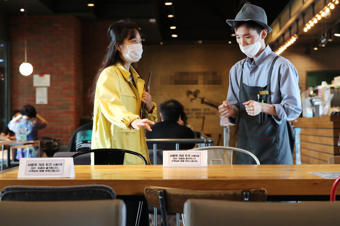 성동구가 대형 카페발 코로나19 집단감염 사례가 발생함에 따라 26일 지역내 주요 커피 프랜차이즈 업소를 대상으로 마스크 상시 착용 여부, 테이블 간 거리두기 등 방역수칙 준수 여부를 확인했다. 사진은 구 관계자가 카페 직원에게 생활 속 거리두기 지침 이행 여부를 점검하는 모습. (사진제공=성동구청)