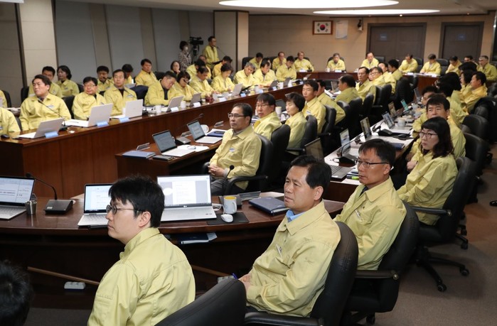 서울 마포구가 3일 구청 재난종합상황실에서 신종 코로나바이러스 감염증 확산 대비 대책회의를 개최했다. 이날 회의는 유동균 구청장을 비롯해 관련 직원들이 참석한 가운데 진행됐다. 사진은 유 구청장과 직원들이 회의를 진행하는 모습. (사진제공=마포구청)