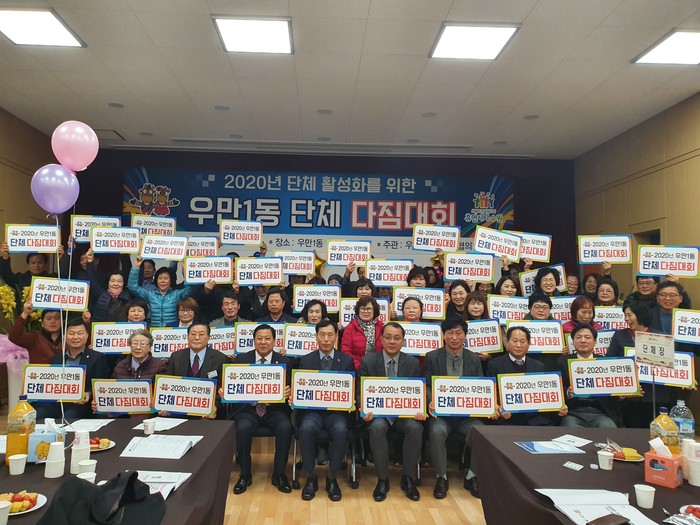 경기 수원시 팔달구 우만1동은 지난 10일 동 행정복지센터 대회의실에서 12개 단체원 150여명이 참석한 가운데 ‘2020년 우만1동 단체 다짐대회’를 개최했다. 사진은 참여자들이 '자치분권' 홍보 카드 섹션을 선보이는 모습. (사진제공=팔달구청)