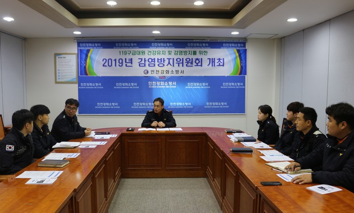 인천 강화소방서는 2일 현장 활동 중 감염성 질병에 노출되기 쉬운 구조·구급대원의 감염 방지를 위해 뉴고려병원 윤병석 구급지도 의사를 초빙한 가운데 '하반기 감염방지위원회'를 개최했다. 사진은 소방대원들이 회의를 하고 있는 모습. (사진제공=강화소방서)