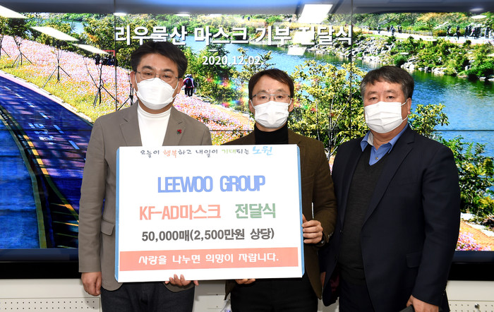 서울 노원구가 2일 (주)리우물산으로부터 코로나19 확산 방지를 위한 KF-AD마스크 5만매를 기부 받았다. 이날 전달 받은 마스크는 지역내 9개 종합사회복지관에 배부된다. 사진은 이날 전달식에 참석한 오승록 구청장(왼쪽) 관계자들과 기념촬영을 하는 모습. (사진제공=노원구청)