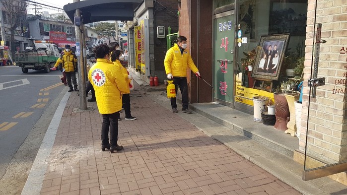 경기 양주시 광적면 적십자봉사회 회원 20명은 최근 코로나19 지역사회 확산 방지를 위해 지역내 버스정류장, 공공화장실, 가래비 5일장 등 지역내 다중이용시설을 대상으로 방역활동을 했다. 사진은 회원들이 방역작업을 하는 모습. (사진제공=양주시청)