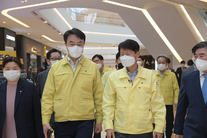 김상호 경기 하남시장이 지난 24일 김강립 식품의약품안전처장, 외식업중앙회와 함께 지역내 대형 쇼핑몰 내 음식점 2곳을 방문해 방역관리 상황 등을 합동점검했다. 이날 김 시장은 김 식약처장 등과 기본 방역수칙 준수 여부, 시설 환기 및 소독 관리 등을 점검하는 한편 코로나19 장기화로 어려움을 겪고 있는 음식점 등 현장의 애로사항을 청취했다. 사진은 김 시장(왼쪽 두 번째)과 김 안전처장이 쇼핑몰을 둘러보며 이야기를 나누는 모습. (사진제공=하남시청)