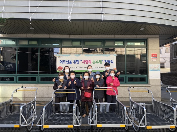 서울 강서구는 최근 사단법인 사랑의자전거와 함께 지역내 폐지·고물 수집 등으로 생계를 유지 중인 노인들에게 ‘사랑의 손수레’ 15대를 전달했다. 사진은 전달식에서 관계자들과 할머니들이 기념촬영을 하고 있는 모습. (사진제공=강서구청)