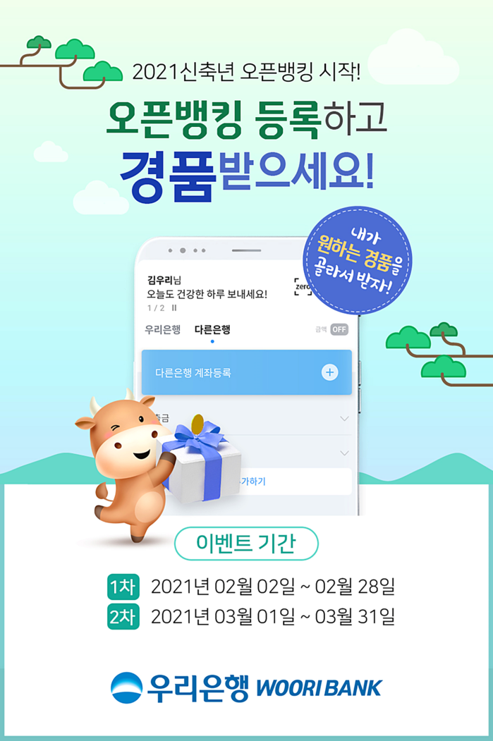 [시민일보 = 홍덕표 기자] 우리은행이 오픈뱅킹 200만 고객달성을 기원하는 '오픈뱅킹 등록하고 원하는 경품 받으세요!' 대고객 이벤트를 오는 3월31일까지 개최한다.