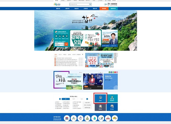 홈페이지 접속 후 하단으로 내려가면 보이는‘일자리’사각 아이콘을 클릭하면 해당 페이지로 이동이 된다. 해당 화면에는 합천군 채용정보, 합천군 일자리 종합센터, 경남 청년일자리사업 메뉴로 구성되어 있으며, 해당 버튼을 누르면 상세 내용을 확인할 수 있다. 특히 채용정보 메뉴의 경우, 기존 고시공고 게시판에 혼재된 정보들 중 일자리 정보만을 등재하여 접근성을 높였다. 합천군 일자리 종합센터(Work-net)는 민간일자리에 대한 다양한 구인·구직 안내를 받을 수 있다.