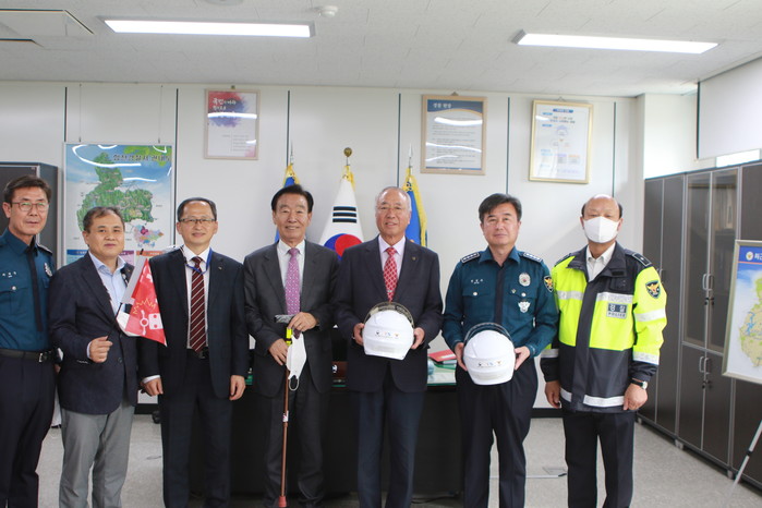 2020. 10. 13. 14:00 경찰서 2층 회의실에서 한국교통안전공단 경남본부장, 안전관리처장 등 관계자와 간담회를 통해 최근 "관내 주요도로 진,출입로 상 고령자 등 보행안전과 이륜차 교통사고예방을 위해 눈에 잘띄는 안전 깃발과 안전 헬멧을 한국교통관리공단 경남본부와 협치로 제작하여 배부함으로써 이륜차 사고예방을 위해 최선을 다하겠다"라고 전했다.