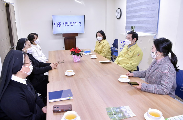 | ▲ 이용섭 광주광역시장이 13일 오전 남구 아동양육시설인 노틀담형제의 집을 방문해 시설 종사자와 입소 아동들을 격려한 뒤 김희순 시설장으로부터 운영상황과 애로사항을 듣고 있다./광주광역시 제공 |