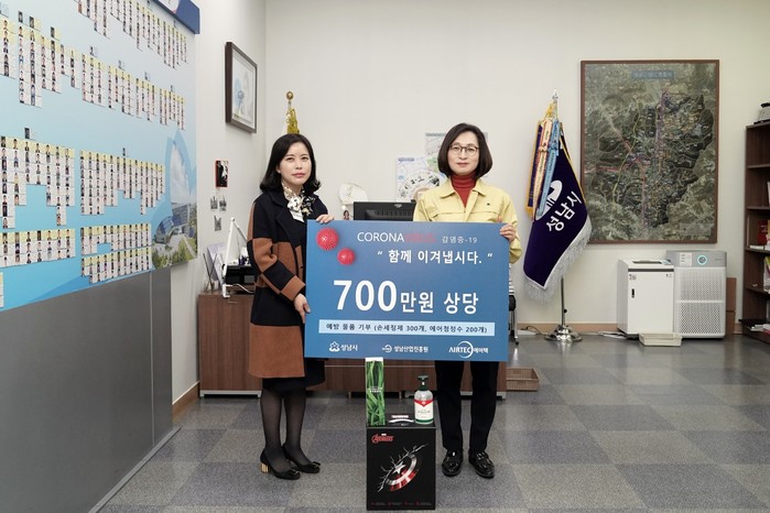 물품 전달식에서 은수미 성남 시장은 “코로나19 바이러스로 어려운 시기에 바이러스 퇴치를 위한 ㈜에어텍의 소중한 기부에 감사드리며, 기부 물품이 뜻깊게 쓰일 수 있도록 하겠다”라고 밝혔다.