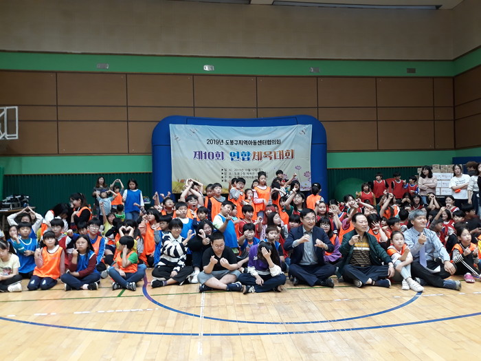 서울 도봉구는 최근 구청 지하 1층 체육관에서 지역아동센터 이용 아동, 학부모, 종사자 등 500여명이 참석한 가운데 ‘제10회 도봉구 지역아동센터 연합 체육대회’를 개최했다. 사진은 아이들과 이동진 구청장이 기념촬영을 하는 모습. (사진제공=도봉구청)