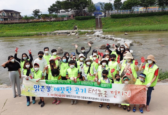 함양군 건강가정·다문화가족지원센터(센터장 박혜경)는 지난 7월 10일 상림 위천 일대에서 모두가족봉사단 30여명이 참석한 가운데 수질정화 봉사활동의 일환으로 ‘EM흙공 던지기’ 캠페인을 실시했다.