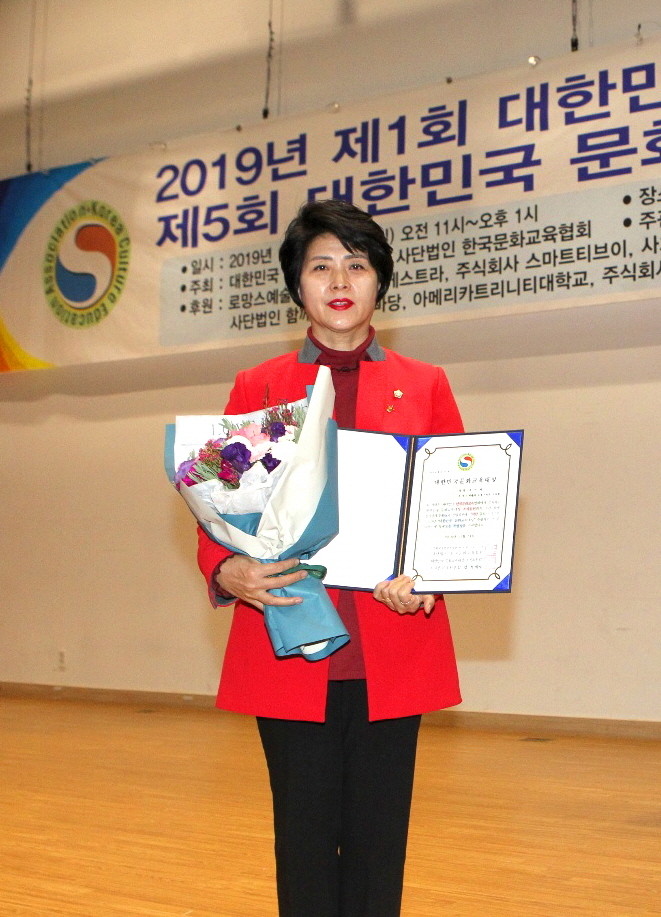 [시민일보 = 황혜빈 기자] 최근 국회의원회관 2층 대회의실에서 열린 ‘2019년 제5회 대한민국 문화교육대상’에서 서울 도봉구의회(의장 이태용) 조미애 의원(자유한국당, 비례대표)이 특별상을 수상했다.