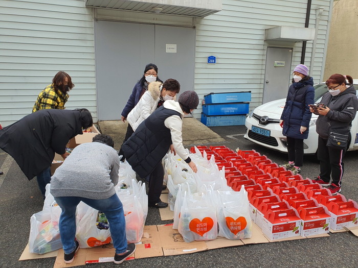 충남 아산시 온양5동 여성자원봉사단이 최근 지역내 저소득 취약계층 45가구에 기초푸드뱅크에서 지원받은 레드비트착즙 1상자(30포입)·즉석죽 등과 용화태권도에서 후원받은 라면으로 구성된 식생활 용품을 전달했다. 사진은 여성자원봉사단 단원들이 대상자들에게 전달할 물품을 준비하고 있는 모습. (사진제공=아산시청)