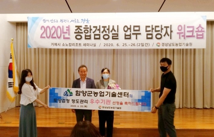 함양군은 2019년도 토양검정 정확도 평가에서 우수한 성적을 거두어 지난 25~26일 경남농업기술원에서 주관한 ‘2020년 토양검정 업무담당자 워크숍’에서 토양검정 우수기관으로 선정 장려상을 수상했다.
