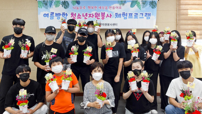 이번 프로그램은 중·고등학생의 신청을 받아 1회당 20명씩 총 2회, 40명의 청소년들이 참여하여 공기정화 등에 효과가 있는 스칸디아모스 화분 100개를 만들었으며, 만든 화분을 합천군 예방접종센터 종사자들에게 합천군 보건소로 청소년 대표 3명이 직접 찾아가 전달했다.