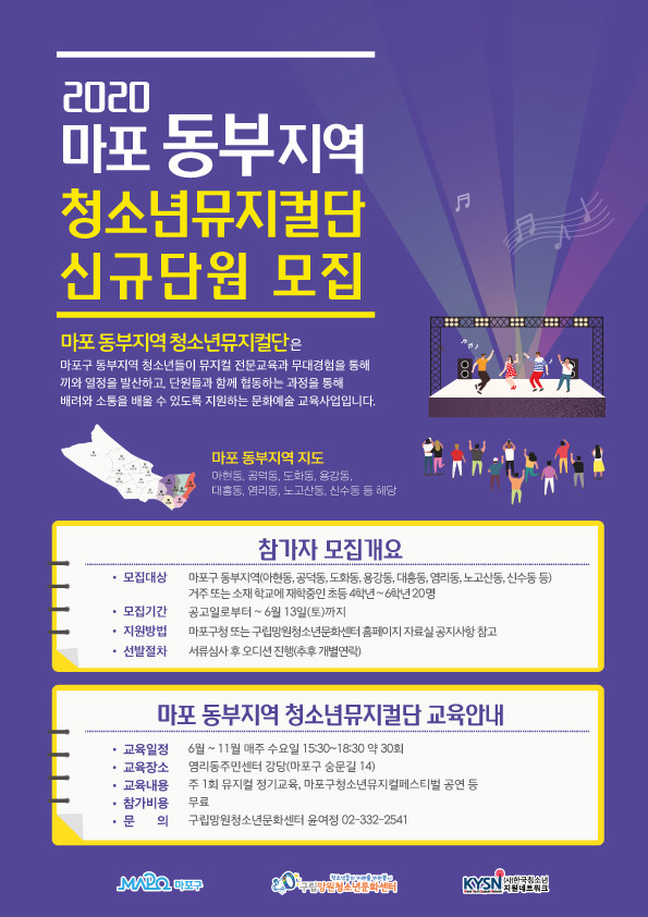 [시민일보 = 홍덕표 기자] 서울 마포구(구청장 유동균)가 '마포 동부지역 청소년뮤지컬단'의 2기 신규 단원을 모집한다고 2일 밝혔다.