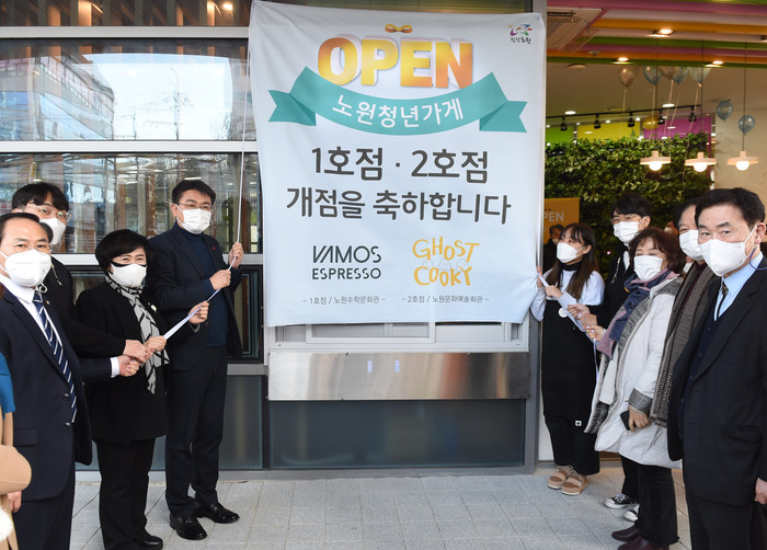 오승록 서울 노원구청장은 지난 2일 노원구청년희망싹티움 사업의 일환으로 구 공공시설내 청년 창업공간을 조성해 청년창업가 육성 및 자립기반 형성에 도움을 주기 위한 노원청년가게 1호점 개점식에 참석했다. 사진은 오 구청장(왼쪽에서 네 번째)이 현판식에 참여하고 있는 모습. (사진제공=노원구청)