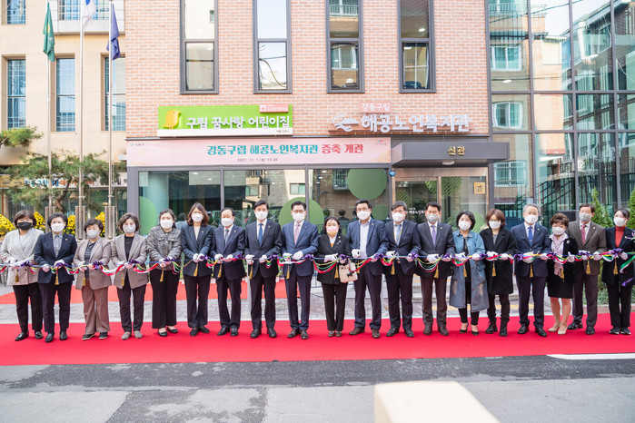 이정훈 강동구청장이 최근 강동구립 해공노인복지관 개관식에 참석했다. 복지관은 지하 1층~지상 4층 규모로 증축 및 리모델링이 진행됐으며, 백세정원·햇살작은도서관 등으로 조성됐다. 사진은 개관식에서 이 구청장(왼쪽 아홉 번째)과 관계자들이 테이프 커팅을 하는 모습. (사진제공=강동구청)
