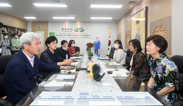 경기 오산시가 최근 시장 집무실에서 오산고현초등학교와 지자체-학교 돌봄협력 모델 구축을 위한 ‘함께자람교실(틈새돌봄) 설치·운영’ 업무 협약을 체결했다. 사진은 협약식에 참석한 곽상욱 시장(맨 왼쪽)이 신경숙 교장 및 관계자들과 회의하는 모습. (사진제공=오산시청)