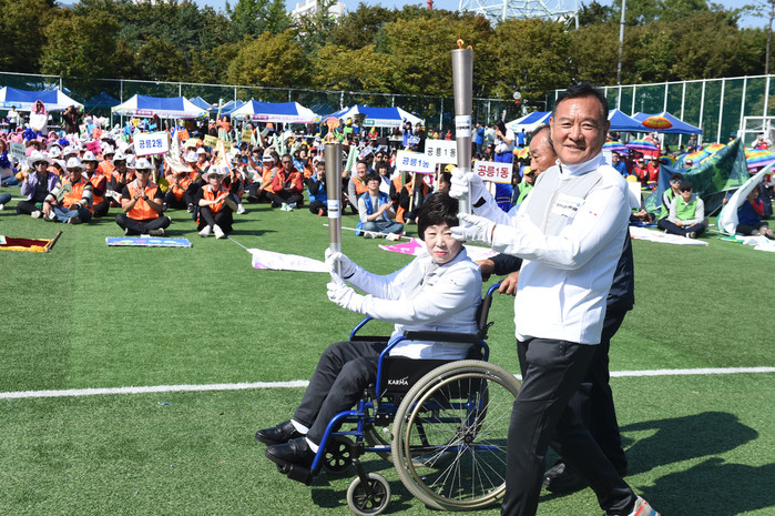 노원구는 13일 상계동 노원마들스타디움에서 선수단 등 구민 300여명이 참석한 가운데 ‘2019 노원구민 체육대회’를 개최했다. 이날 배구, 줄다리기 등의 경기가 펼쳐졌다. 사진은 경기 시작 전 성화봉송을 하는 모습. (사진제공=노원구청)