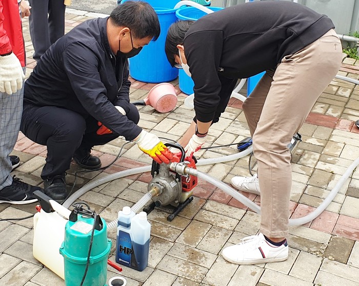 경기 수원시 장안구는 지난 28일 구와 각 동의 재해담당 공무원을 대상으로 ‘수해대비 수방자재 사용법’ 교육을 실시해 수해 발생 시 신속하게 대처할 수 있는 현장대응능력을 강화하기 위해 엔진펌프와 수중펌프를 직접 작동해보며 실전에 대비했다. 사진은 이날 교육이 진행되고 있는 모습. (사진제공=장안구청)