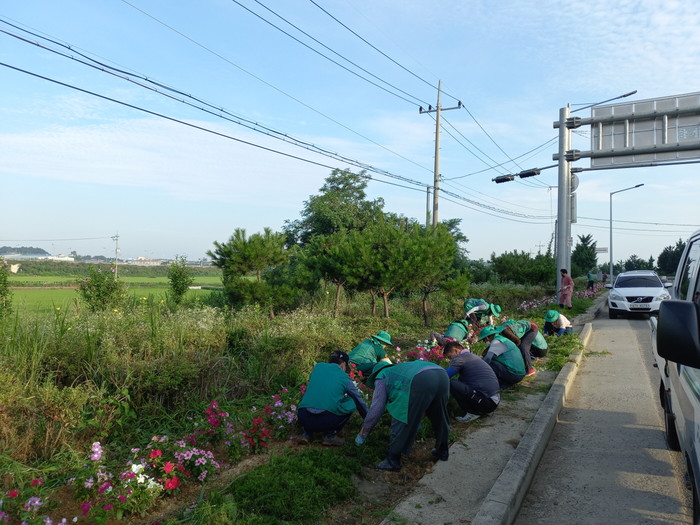 충남 아산시 둔포면 새마을 남·여협의회가 지난 20일에 산전사거리 인근 가로화단 제초작업과 쓰레기 수거 환경정화 활동을 실시했다. 사진은 이날 회원들이 가로화단에서 제초작업을 하고 있는 모습. (사진제공=아산시청)