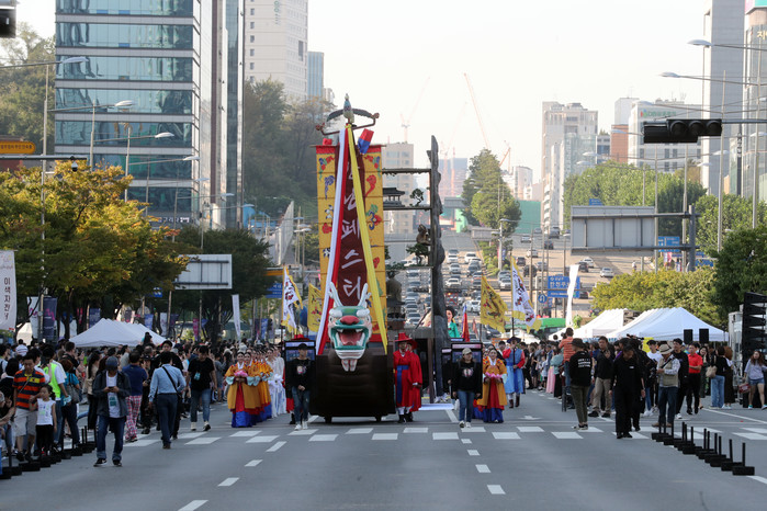 강남구는 최근 삼성동 영동대로에서 ‘차 없는 거리 K-POP 퍼레이드’를 진행했다. 이날 퍼레이드는 총 800여명이 참여한 가운데 전통사자춤부터 K-POP 댄스 등 8가지 테마로 진행됐다. 사진은 거리 퍼레이드가 진행되고 있는 모습. (사진제공=강남구청)