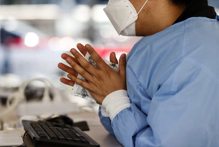 한파주의보가 발령된 17일 오전 서울역에 설치된 중구임시선별검사소에서 관계자가 핫팩으로 손을 녹이고 있다.
