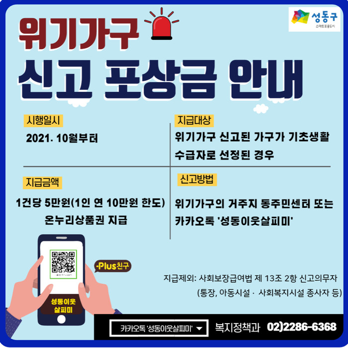 해당 가구 발견 시 신고자는 대상자 거주지 동주민센터와 카카오톡 채널 성동이웃 살피미 등을 통해 신고할 수 있다.