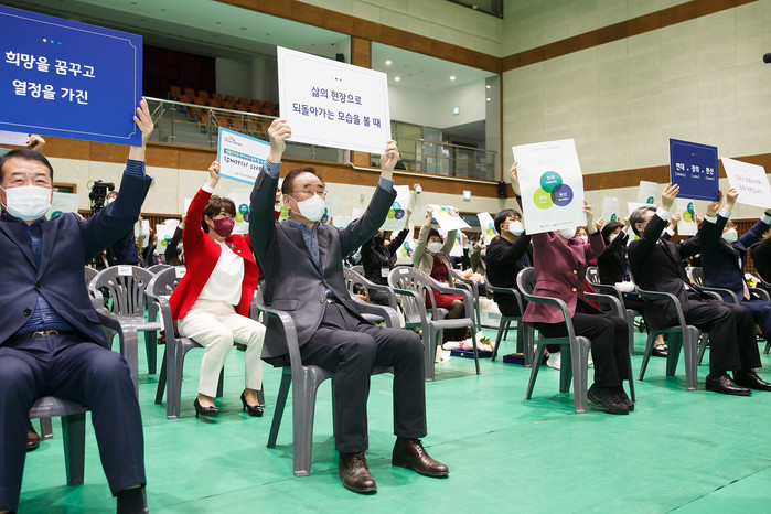 경북 구미시는 30일 제15회 사회복지사의 날을 맞아 시민의 복지 향상을 위해 노력하는 사회복지사의 노고를 격려하고자 '구미시 사회복지사 대회'를 개최했다. 사진은 대회에 참가한 장세용 시장(왼쪽 두 번째)이 복지사 응원 퍼포먼스를 함께하고 있는 모습. (사진제공=구미시청)