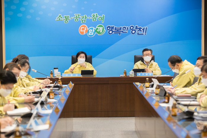 서울 양천구는 지난 8일 수도권의 사회적 거리두기 2.5단계 상향에 따른 방역 특별대책을 정비하기 위해 비상대책회의를 개최했다. 사진은 김수영 구청장(가운데 왼쪽)이 회의를 진행하면서 구의 대응 준비에 대해 발언을 하고 있는 모습. (사진제공=양천구청)