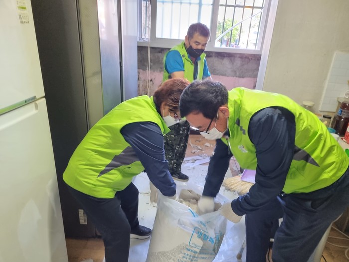 경기 양주시 양주1동 지역사회보장협의체는 최근 지역내 취약계층을 대상으로 ‘사랑의 집 고치기’ 사업을 추진했다. 사진은 이날 봉사자들이 주택 노후로 열악한 환경에 노출된 노인가구를 방문해 청소, 도배, 장판교체 등 주거환경 개선사업을 하고 있는 모습. (사진제공=양주시청)