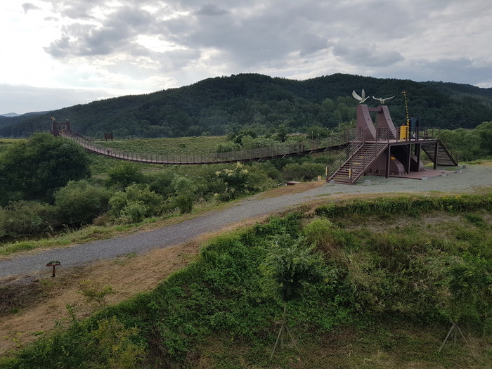 가을바람 맞으며 탐방로를 거닐다 보면 산밖벌 끝머리 제방 쪽 토평천 하류에 설치된 길이 98.8m, 보행폭 2m의 우포출렁다리(창녕군 이방면 옥천리 756번지)가 나온다.