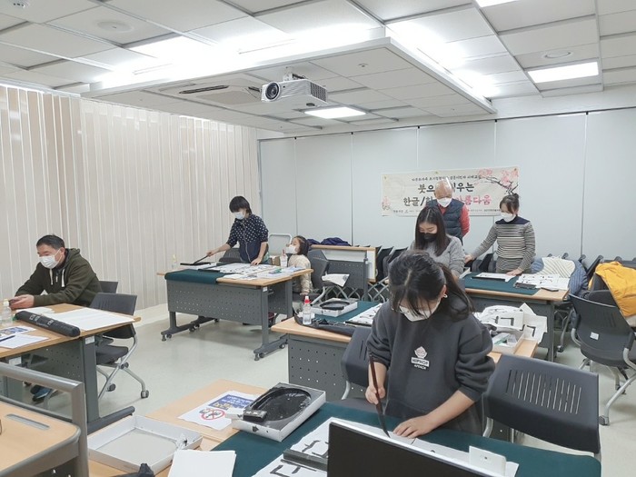 경기 이천시가 최근 시 건강가정·다문화가족지원센터에서 이천구만리봉사회 후원으로 다문화가족이 함께하는 '한글서예교실'을 총 11회 운영했다. 사진은 수강생들이 한글 붓글씨를 쓰고 있는 모습. (사진제공=이천시청)