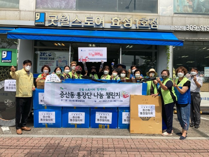 서울 은평구 증산동 주민센터에서는 지난 20일 증산동 통장협의회 주관으로 굿윌스토어 은평점에 물품을 기증하는 ‘나눔 챌린지’를 진행했다. 이날 통장협의회는 의류 200점·잡화 130점 등 총 549점, 100만원 상당의 물품을 기부했다. 사진은 전달식에서 관계자들이 기념촬영을 하는 모습. (사진제공=은평구청)
