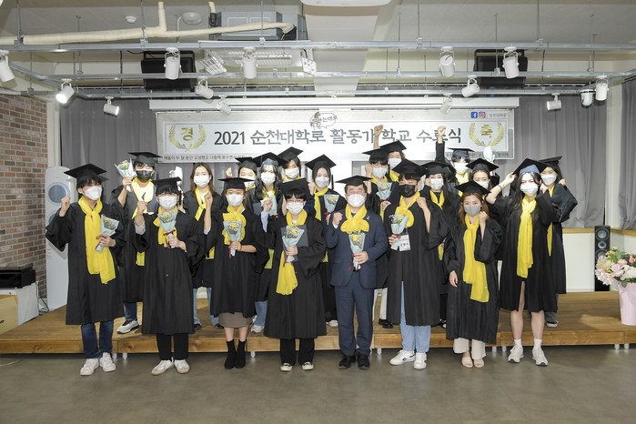 ▲ 순천대학로 활동가 학교 수료식에 참석한 허석 시장(앞줄 오른쪽 네 번째)이 수료한 학생들과 기념촬영을 하는 모습. (사진제공=순천시청) |