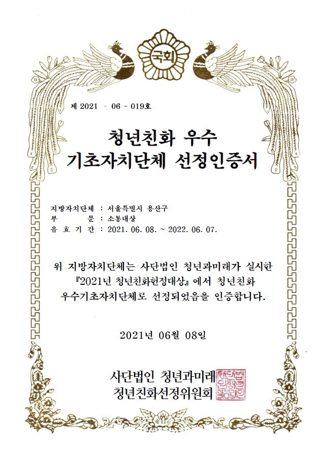 | ▲ 청년친화 우수 기초자치단체 선정인증서. (사진제공=용산구청) |