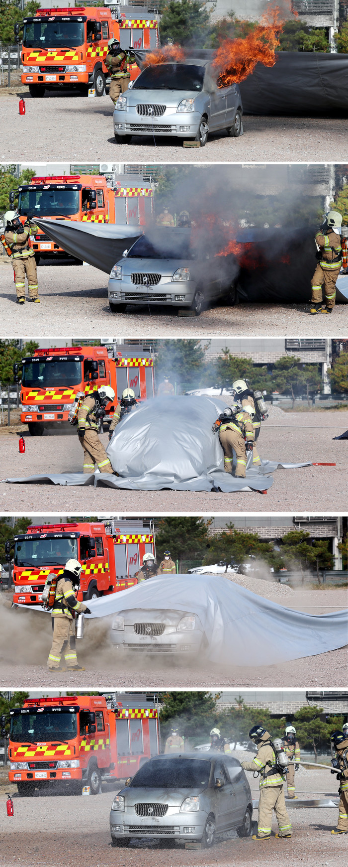 3일 오전 인천 계양구 계양체육관 인근 공터에서 열린 '인천 계양소방서 질식소화포 화재진압훈련'에서 소방대원들이 승용차에 난 불을 질식소화포로 진화하는 훈련을 하고 있다. 질식소화포는 불이 난 물체에 난연성 재질의 천을 덮어 산소 유입을 차단해 불을 끄는 소방장비다. 소방당국은 이 장비가 전기차량 화재 대응에 큰 도움이 될 것으로 보고 있다.